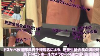 【期間限定】【●100▲100】ドスケベ放送部員男子複数名による、廻里生徒会長の演説時真下のピンホールカメラからの逆さ撮り盗撮動画ライブ鑑賞の様子(Vol.006:私服演説で盗撮されたフルバックパンティ)